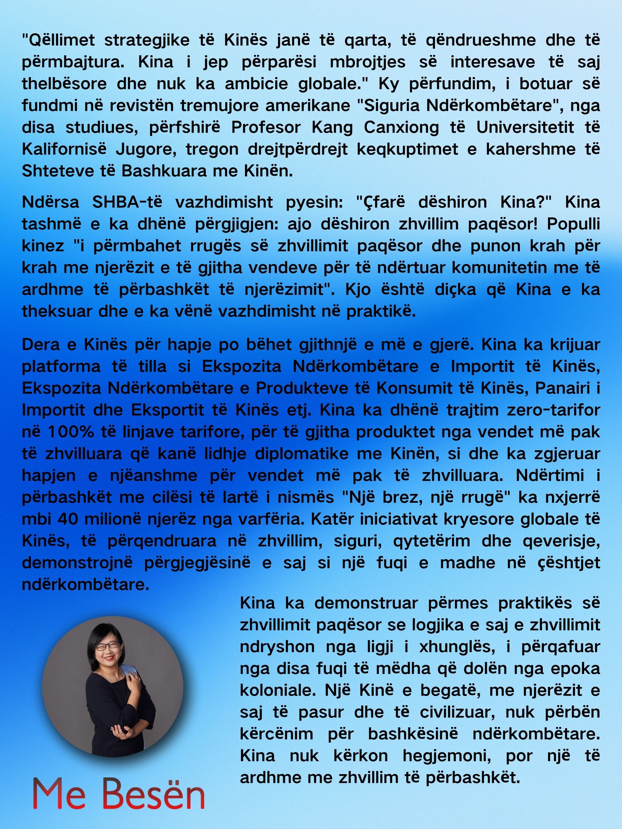 Le të fillojmë me pyetjen: "Çfarë dëshiron Kina?"14:06:00 2025-10-07ShareLAJMET KRYESOREKina dhe ShBA-ja zhvillojnë bisedimet ekonomike e tregtare në Kuala-LumpurMë 25–26 tetor, He Lifeng, zëvendëskryeministër dhe përfaqësues kryesor i palës kineze për çështjet tregtare, zhvilloi bisedimet ekonomike dhe tregtare midis Kinës dhe Shteteve të Bashkuara në Kuala-Lumpur të Malajzisë me sekretarin amerikan të Thesarit, Scott Bessent, dhe Përfaqësuesin Tregtar të26-Oct-2025LAJME TË NGJASHMEXi i dërgon mbretit të Tajlandës mesazh ngushëllimi për ndarjen nga jeta të Nënës Mbretëreshë SirikitPresidenti i Kinës, Xi Jinping, i dërgoi të dielën një mesazh ngushëllimi mbretit të Tajlandës Maha Vajiralongkorn Phra Vajiraklaochaoyuhua për ndarjen nga jeta të Nënës Mbretëreshë Sirikit. Në mesazhin e tij, Xi vuri në dukje që Nëna Mbretëreshë Sirikit gëzonte një prestigj të lartë në zemrat e26-Oct-2025Xi i dërgon mbretit të Tajlandës mesazh ngushëllimi për ndarjen nga jeta të Nënës Mbretëreshë SirikitKina lëshon satelit të ri për përmirësimin e hartografisë globale me saktësi të lartëTË TJERA NGA CGTNDuke kujtuar Ditën e Rikthimit, duke realizuar ëndrrën e ribashkimit1Duke kujtuar Ditën e Rikthimit, duke realizuar ëndrrën e ribashkimit2Nisja nga Pekini, takimi përsëri në Pekin3Ribashkimi është tendenca e përgjithshme, bashkimi është rruga e duhur4Lidhur me Detin e Kinës Jugore, bashkëpunimi është rruga e duhur
