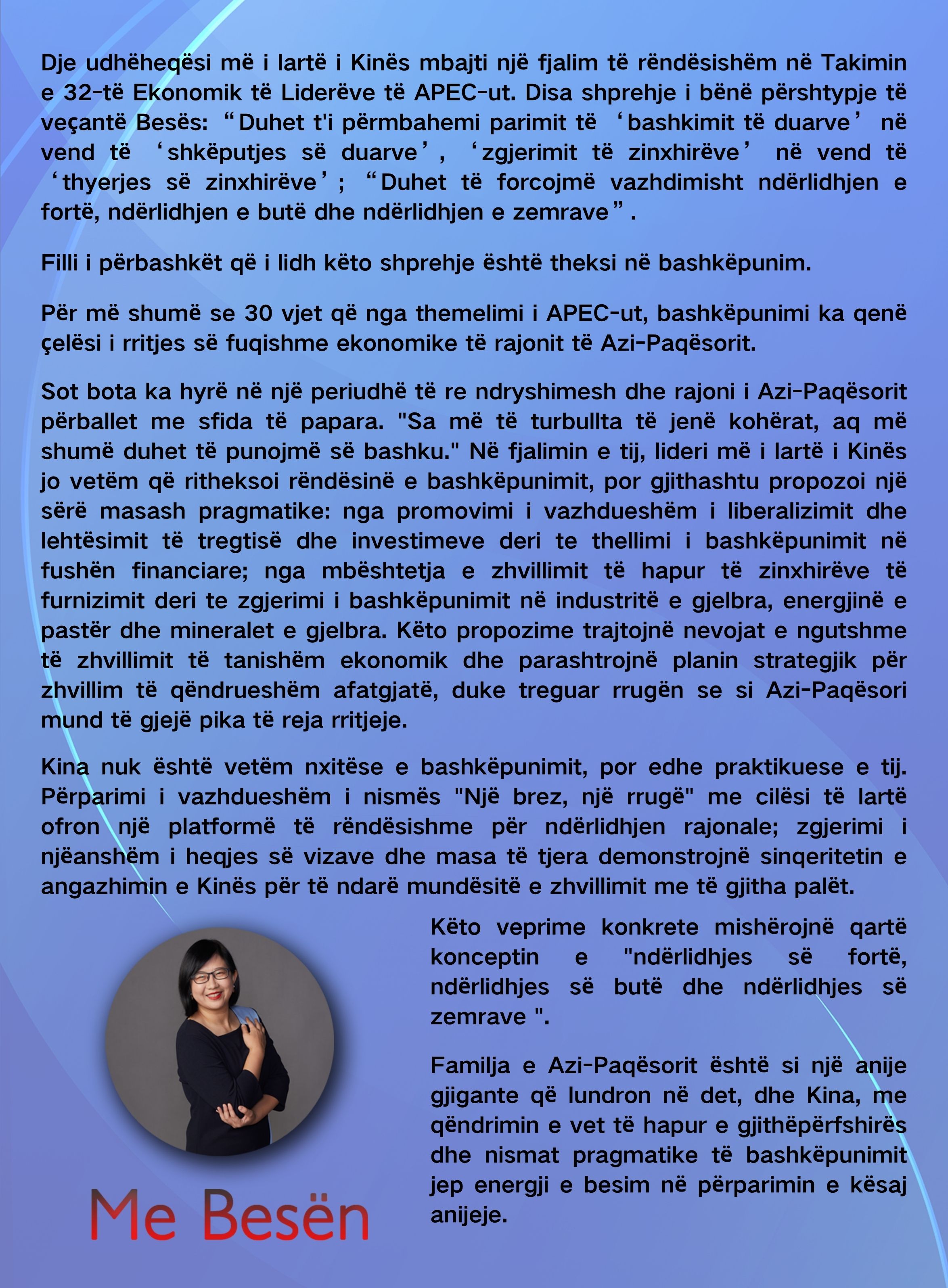 Dëshmi e besimit të Kinës në "ndërlidhjen e fortë, ndërlidhjen e butë dhe ndërlidhjen e zemrave" nëpërmjet "bashkimit të duarve"11:45:04 2025-11-01ShareLAJMET KRYESOREXi Jinping-u zhvillon bisedime me presidentin koreanojugor Lee Jae-myungTë shtunën pasdite, presidenti kinez Xi Jinping dhe homologu i tij koreanojugor Lee Jae-myung zhvilluan bisedime në Muzeun e Gyeongju-t. Gjatë bisedimeve, presidenti Xi vuri në dukje që Kina dhe Koreja e Jugut janë vende fqinje dhe partnere bashkëpunimi. Gjatë 33 vjetëve pas vendosjes së01-Nov-2025LAJME TË NGJASHMEXi Jinping-u përfundon pjesëmarrjen në Takimin e 32-të Ekonomik të Liderëve të APEC-ut dhe vizitën shtetërore në Korenë e JugutTë shtunën në mbrëmje, presidenti kinez Xi Jinping përfundoi pjesëmarrjen në Takimin e 32-të Ekonomik të Liderëve të APEC-ut dhe vizitën shtetërore në Korenë e Jugut, u kthye në Pekin. Kur u largua nga Busani, presidentin Xi Jinping e përcollën në aeroport ministri i jashtëm koreanjugor Cho Hyun01-Nov-2025Xi Jinping-u përfundon pjesëmarrjen në Takimin e 32-të Ekonomik të Liderëve të APEC-ut dhe vizitën shtetërore në Korenë e JugutKina propozon bashkëpunim për lulëzimin e rajonit të Azi-PaqësoritTË TJERA NGA CGTNKinë e hapur, Azi-Paqësor i lulëzuar1Kinë e hapur, Azi-Paqësor i lulëzuar2Duke kujtuar Ditën e Rikthimit, duke realizuar ëndrrën e ribashkimit3Nisja nga Pekini, takimi përsëri në Pekin4Ribashkimi është tendenca e përgjithshme, bashkimi është rruga e duhur